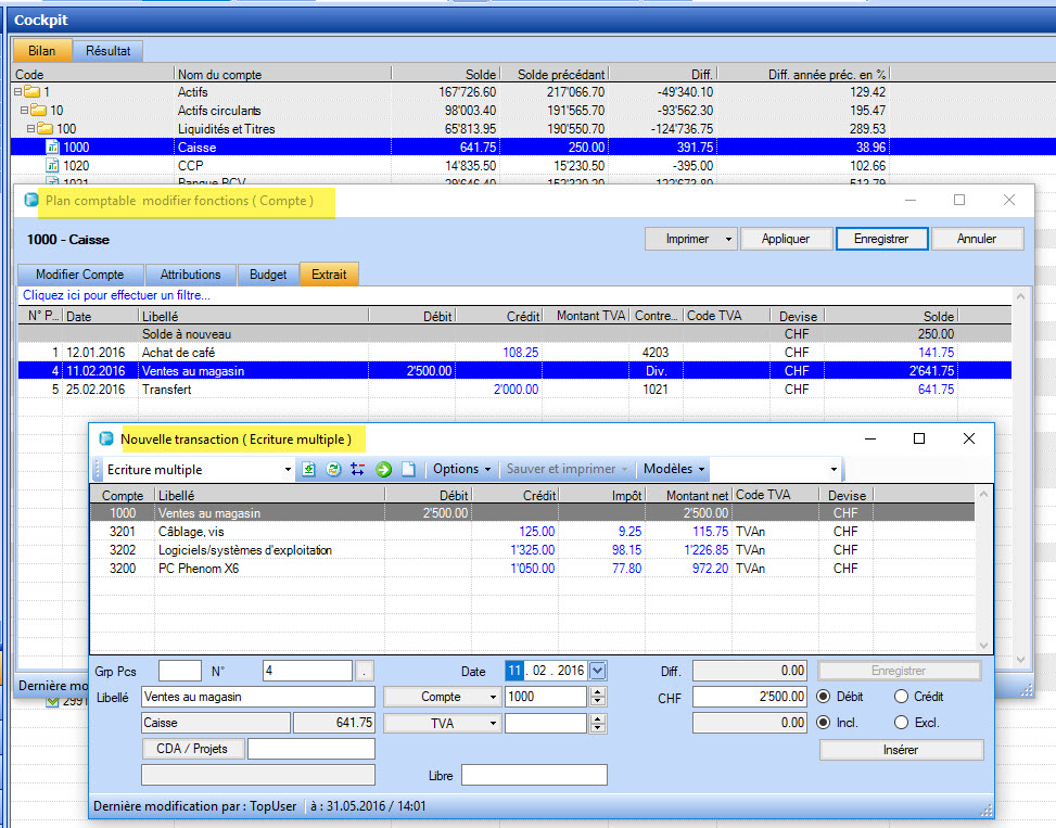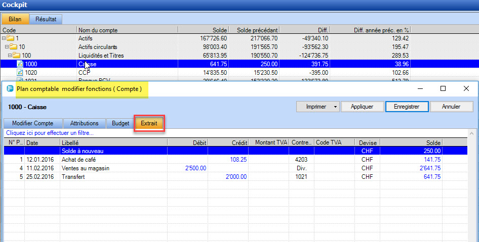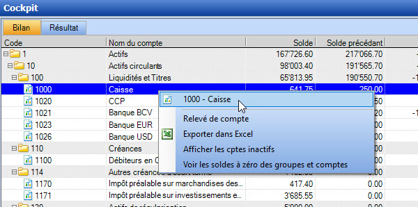 Le Cockpit vous permet d’examiner et d'éditer les comptes de près. Les comptes peuvent être modifiés par un double-clic ou via le menu contextuel > Relevé de compte.