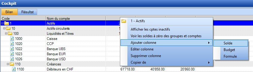 Le menu contextuel de l'en-tête de colonne permet d’ajouter les colonnes Solde, Budget et Formule.