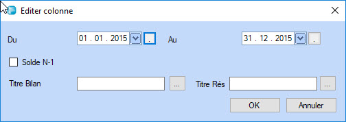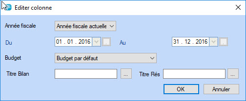 Indication de la période et du titre de la colonne. Définissez l'année fiscale et les titres Bilan/Résultat souhaités des colonnes.