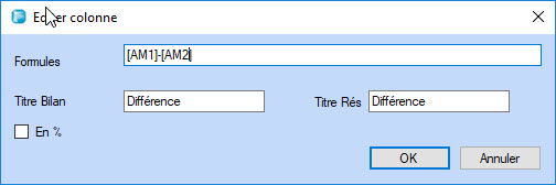 Les colonnes de formule sont utilisées pour calculer les écarts et/ou les pourcentages des colonnes Solde ou Budget. Dans le champ Formules se saisissent les paramètres requis pour le calcul. Les formules pour les colonnes respectives doivent être indiquées comme suit :