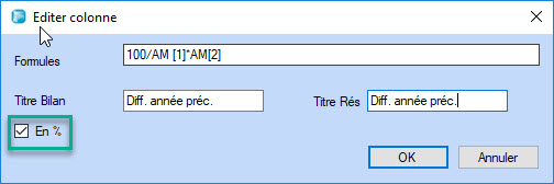 La case à cocher En % affiche le résultat dans les rapports avec le signe du pourcentage. Pour les résultats en pourcentage, la formule peut également être saisie avec le facteur 100, des multiplications et des divisions.