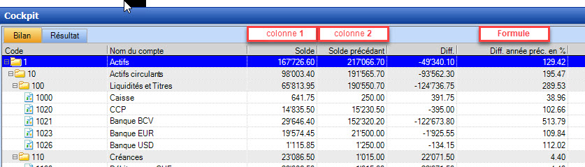 Figure 8 : Cockpit - Colonne 1 : Solde, Colonne 2 : Solde précédent, Colonne 3 : Différence, Colonne 4 : Formule Différence en pourcentage