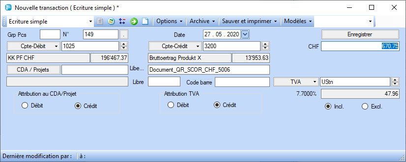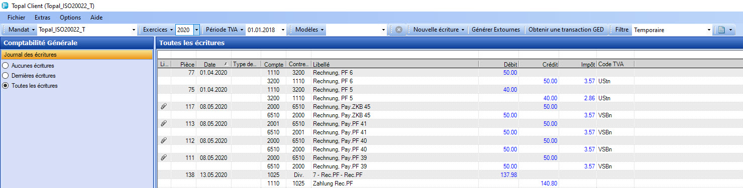 Une fois la transaction sauvegardée, elle est affichée dans la grille de la comptabilité générale (Figure 5) et la pièce est liée.