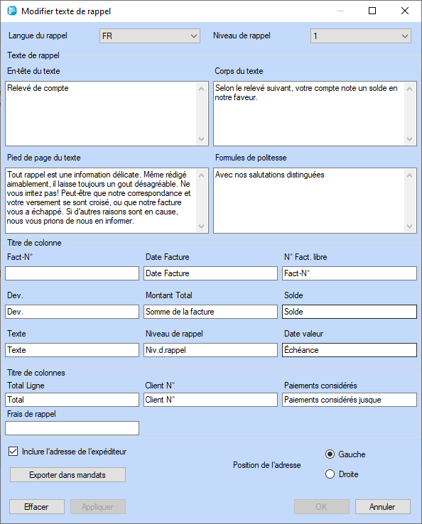Les textes de rappel peuvent être rédigés en plusieurs langues par niveau de rappel (voir figure 2). Pour créer un nouveau texte de rappel, sélectionnez le niveau de rappel et la langue souhaité. Saisissez ensuite l'en-tête, le corps, le pied de page et la formule de politesse dans les champs prévus. Définissez si l'adresse doit apparaître sur le côté gauche ou droit de la lettre. Grâce à la fonction "Exporter dans mandats", vous pouvez copier les textes dans vos autres mandats.