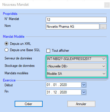 Si vous créez une nouvelle base de données, le mandat est créé dans une base de données distincte et peut être traité indépendamment des autres mandats. Si vous choisissez une partition, le mandat est stocké dans une base de données avec d'autres mandats (comme c'est le cas jusqu'à présent dans Topal).