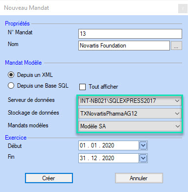 Lorsque vous créez un nouveau mandat, tous les comptes et données de base du mandat modèle sont copiés. Sous Exercice, dans la partie inférieure du dialogue, il est important d'insérer ici le premier exercice géré dans ce mandat. Il n'est pas possible de créer un exercice antérieur ultérieurement. La dernière étape consiste à lancer le processus avec le bouton [Créer].