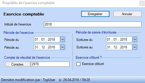 [Exercice > Propriétés] : en activant la case à cocher Exercice clôturé, vous pouvez clôturer l'exercice entier et la verrouiller. Dans un exercice clôturé, aucune écriture ne peut être ajoutée. Si vous désirez autoriser la saisie uniquement dans une certaine période, vous avez la possibilité de définir des dates dans les champs [Période de saisie d’écritures | Ecritures du / au].