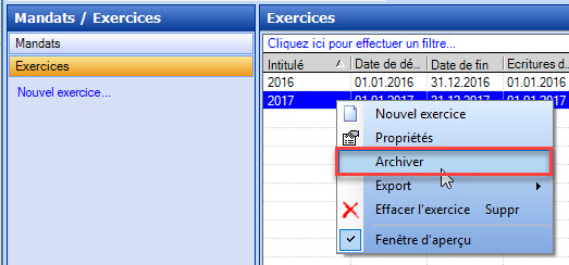L'archivage s'effectue de la même manière que la sauvegarde d'un mandat et crée un fichier de backup XML pour cette année fiscale. Pour pouvoir procéder à un archivage, l'exercice comptable doit être déverrouillé et toutes les propositions de paiements des débiteurs/créanciers doivent être comptabilisées. Veuillez noter qu’il n’est pas possible d’importer un exercice archivé dans un mandat existant.