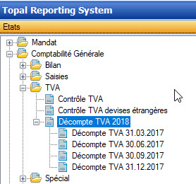 La réconciliation est intégrée dans l’état décompte TVA du domaine de rapports comptabilité générale du Topal Reporting System. Topal permet ainsi de réaliser un décompte séparé pour la réconciliation annuelle du décompte de la TVA suisse. Topal sélectionne toutes les écritures de l’année civile qui n’ont pas encore été déclarées à l’administration fiscale et les regroupe dans un décompte TVA séparé.