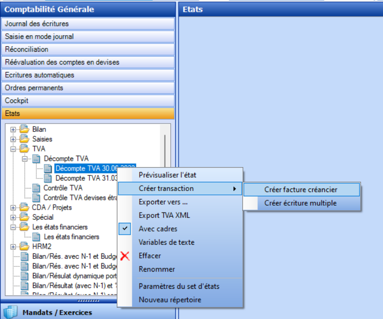 Dans une étape suivante, il est possible de créer une transaction directement à partir du décompte TVA.
