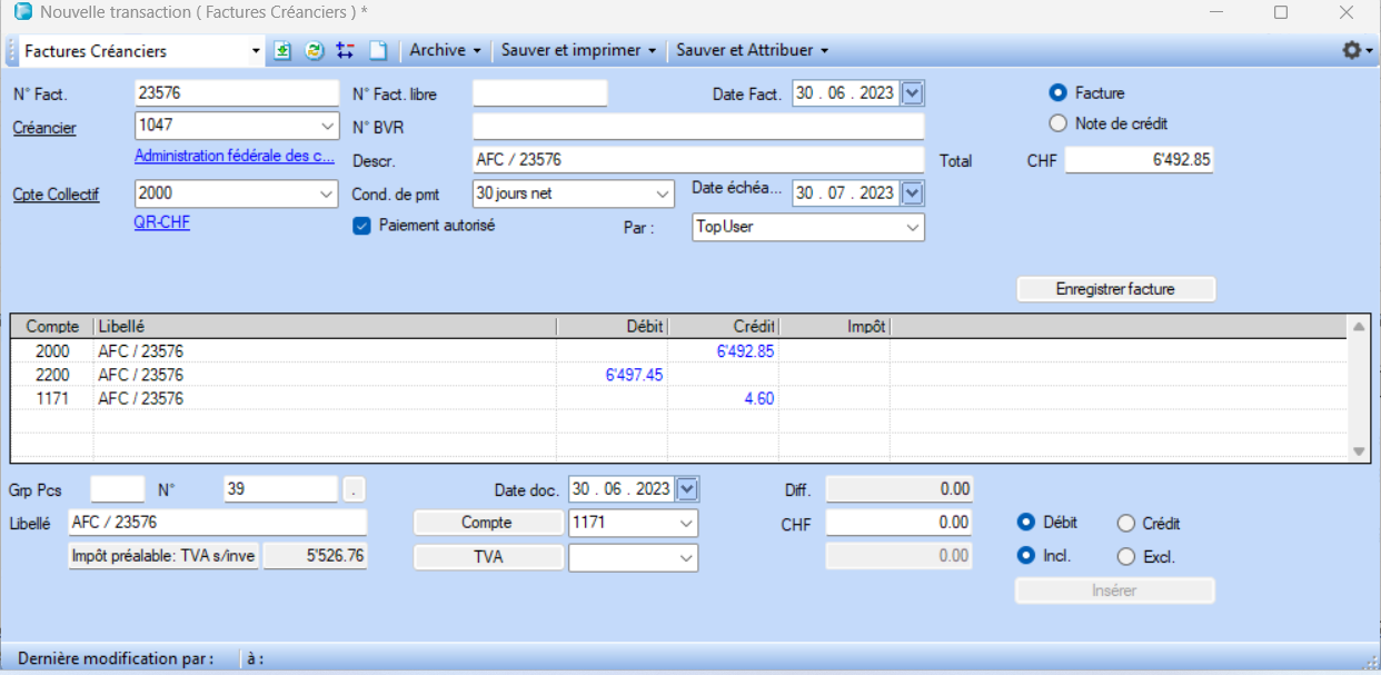 Dès que l'adresse, dans ce cas l'AFC, est sélectionnée dans le champ "Créancier", l'écriture complète est automatiquement créée avec les comptes de TVA comme contrepartie.