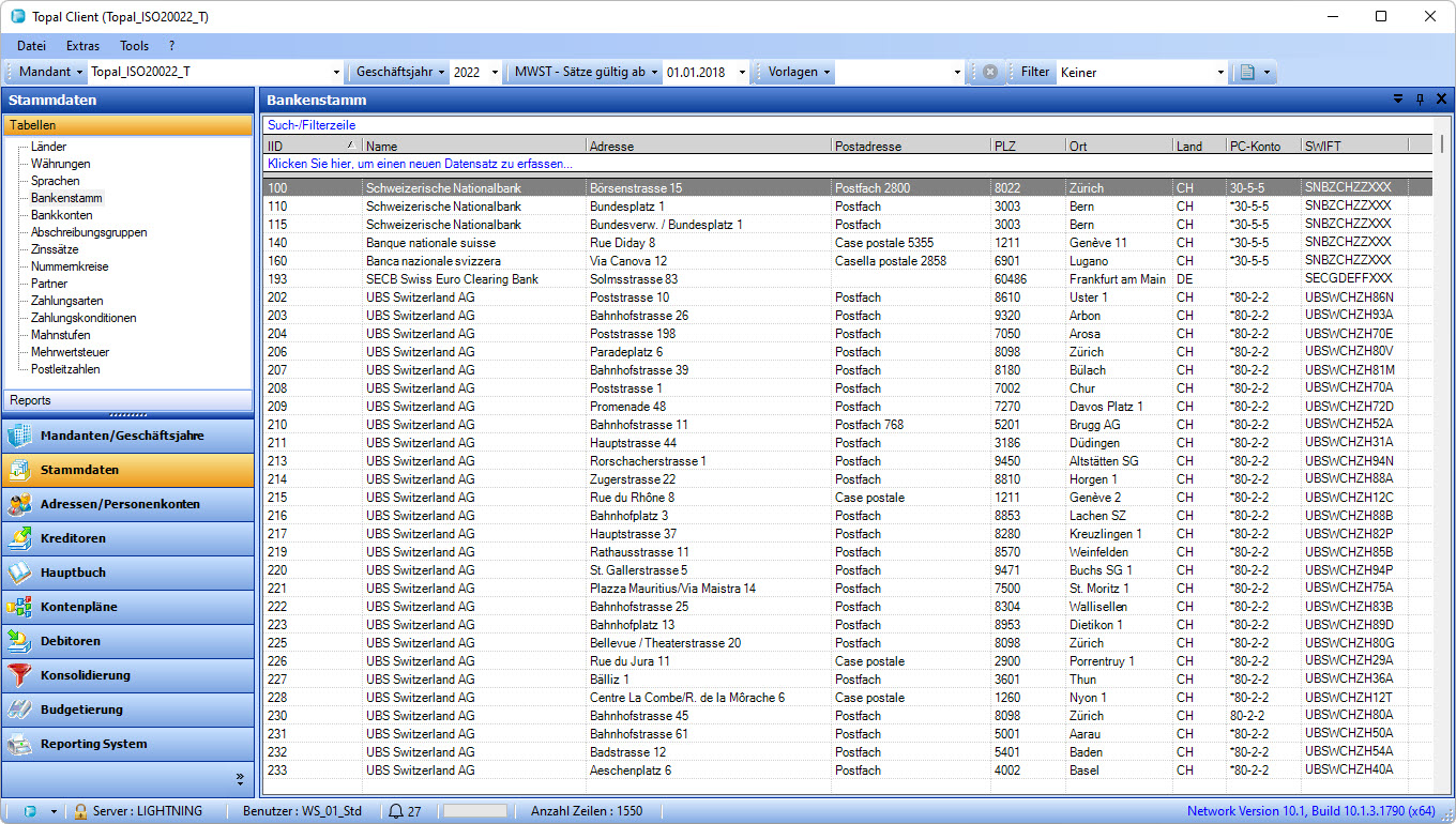 Als Voraussetzung zur reibungslosen Abwicklung des elektronischen Zahlungsverkehrs enthält Topal den gesamten Schweizer Bankenstamm. Das unterstützt Sie beim Erfassen der Bankverbindungen Ihrer Kunden und Lieferanten, die in den Transaktionsmethoden der Personenkonten gespeichert werden, ebenso wie beim Anlegen der eigenen Bankkonten. Wo immer im Programm eine Bankverbindung erfasst werden muss, lässt sich aus dem Feld für die Clearing-Nummer die Liste des Bankenstamms aufrufen, so dass Sie die gewünschte Bank suchen und übernehmen können.