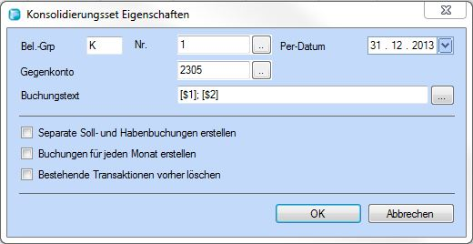 2. Wählen Sie auf Wunsch eine Beleggruppe aus, mit der die Konsolidierungs - Sammelbuchungen gekennzeichnet werden sollen. Ändern Sie, wenn nötig, den Nummernkreis, und geben Sie das Stichdatum der Konsolidierung an. Es werden alle Buchungen bis zu diesem Datum berücksichtigt.