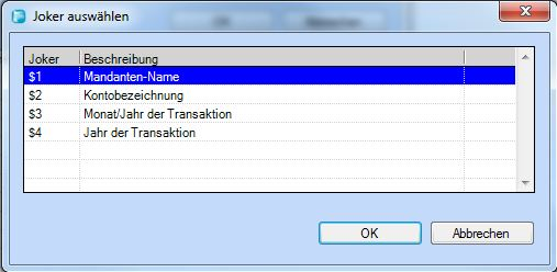 4. Wählen Sie Joker (Abbildung 3) für den Buchungstext aus, indem Sie auf den quadratischen Button hinter dem Textfeld klicken. Die Mandantenbezeichnung, die Kontenbezeichnung, der Monat und das Jahr der Konsolidierung stehen Ihnen mit den Kürzeln $1 bis $4 zur Verfügung.