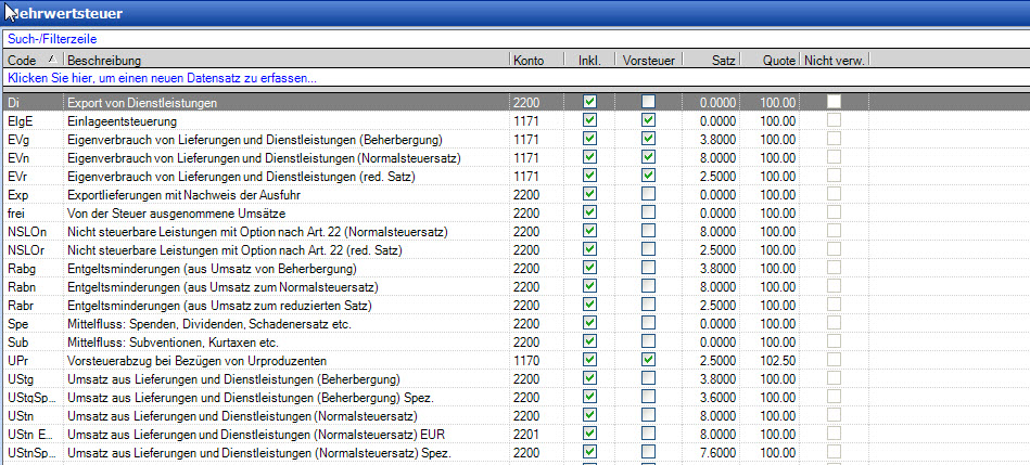 Die Konten im Standard-Kontenplan sind bereits mit Steuerschlüsseln ausgestattet, so dass in Bezug auf die Mehrwertsteuer beim Einrichten eines neuen Mandanten nicht viel Arbeit anfällt.