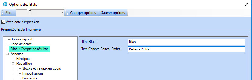Bilan / compte de résultat Le bilan et le compte de résultats sont intégrés dans l’état de manière standard. L'affichage de sortie peut être modifié via la case à cocher dans Options rapport. Figure 1: Propriétés du bilan / compte de résultat