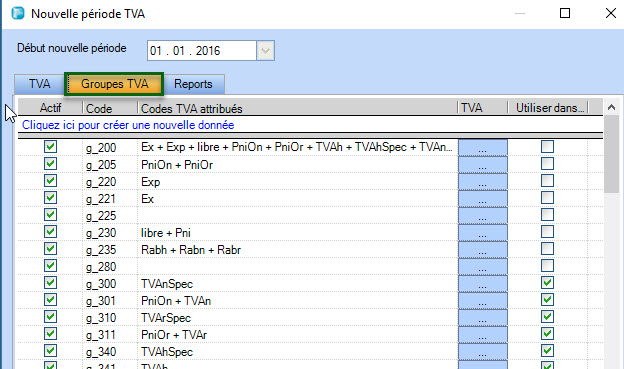 Le dialogue Editer période TVA contient les registres TVA - Groupes TVA - Reports.