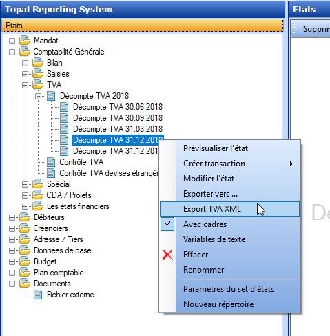 Dans le cadre de la digitalisation, l'AFC a commencé à soumettre la TVA par voie électronique. À cet effet, un fichier XML doit être créé pour permettre un téléchargement sur le site web de la l'AFC. Une exportation XML TVA est disponible dans le Topal Reporting System ainsi que dans la Comptabilité générale.