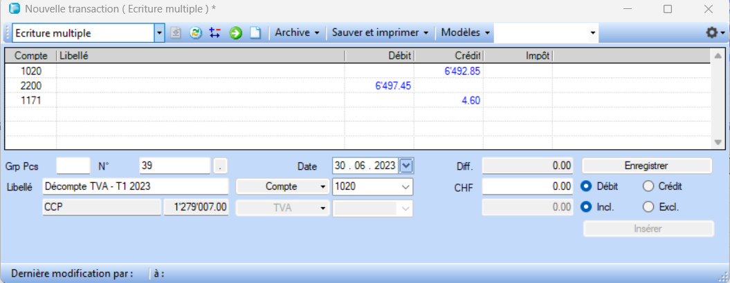 Important : Le comportement est en principe le même pour une écriture multiple. Ici, l'écriture est créée automatiquement dès que le compte collectif (compte bancaire, compte de débit TVA) est indiqué.