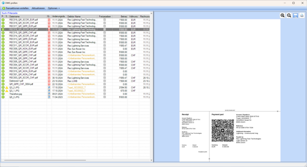 "gelb" ausgewiesen werden. Rechnungen, die weder über eine Referenzzeile noch einen QR-Code verfügen, werden mit einem "Error" Icon im Status ausgewiesen. Diese lassen sich aber trotzdem