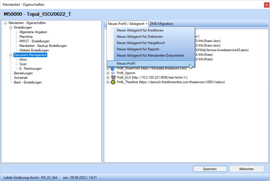 DMS System. Hinzufügen eines neuen Profil's erreichen Sie durch anwählen des Dropdowns [Neues Profil / Ablageort | Neues Profil]. Es wird ein Dialog ersichtlich