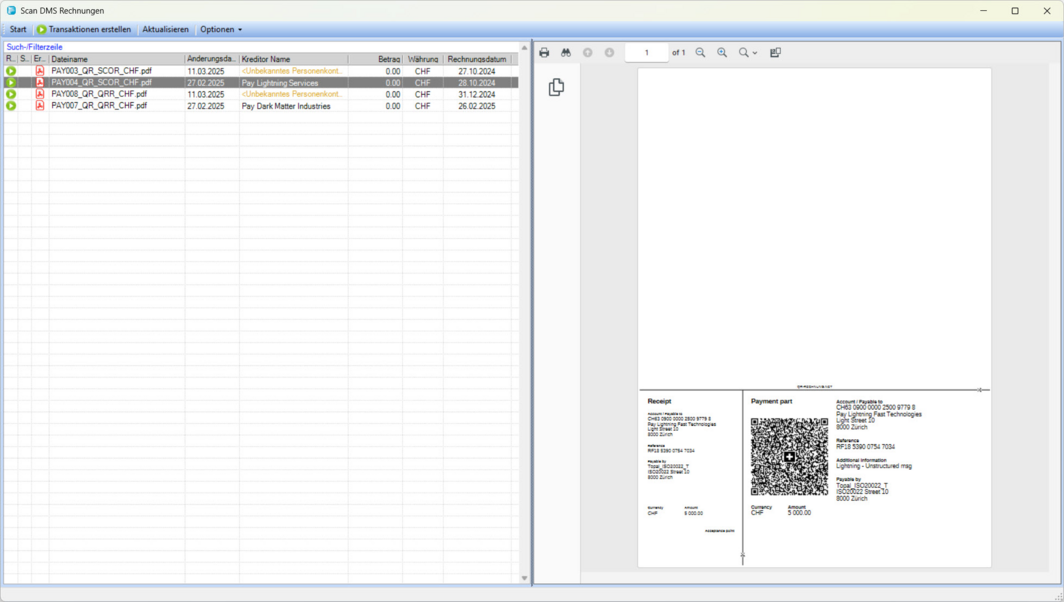 "gelb" ausgewiesen werden. Rechnungen, die weder über eine Referenzzeile noch einen QR-Code verfügen, werden mit einem "Error" Icon im Status ausgewiesen. Diese lassen sich aber trotzdem