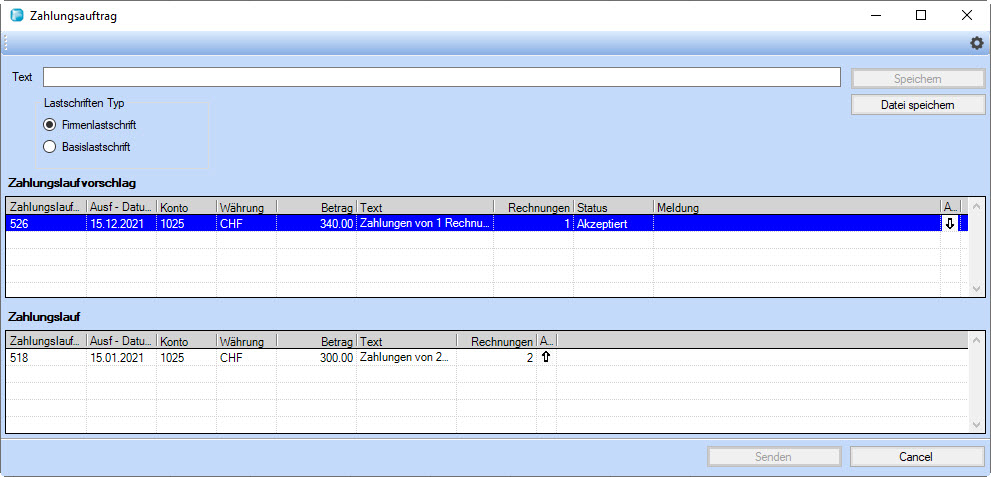 aktuellen Zahlungsauftrag, während in der unteren Liste sämtliche derzeit offenen Zahlungsläufe aufgelistet werden.