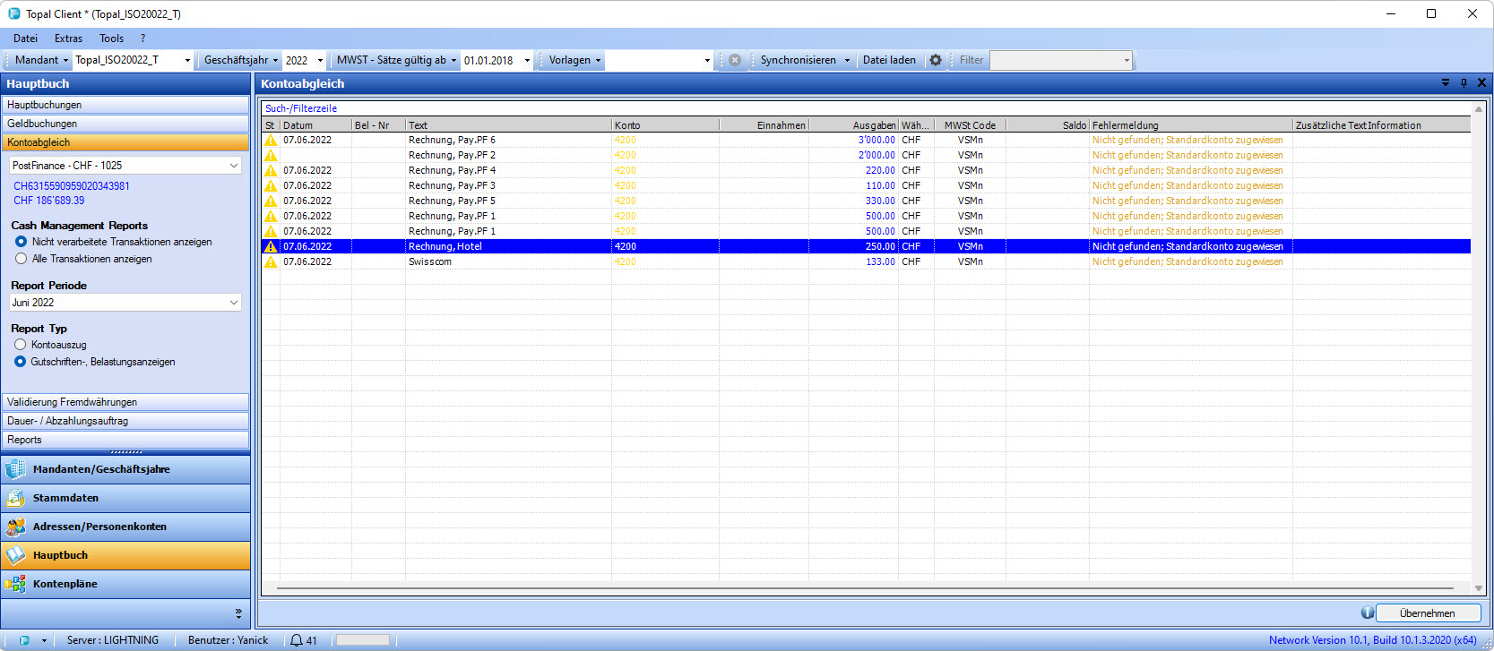 Cette grille est conçue comme un assistant. Les transactions ne sont créées que lorsque le bouton [Appliquer] est exécuté. Si le bouton est actionné, toutes les transactions sont créées dans le grand livre. Les écritures simples et multiples sont prises en compte.