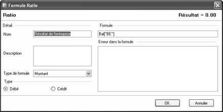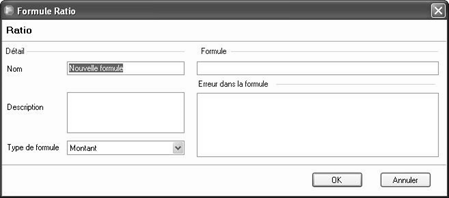 La fenêtre Formule Ratio est comme celle des ratios sauf qu’elle a en plus une partie Type qui permet de choisir si le montant affiché est positif ou négatif dans les rapports.