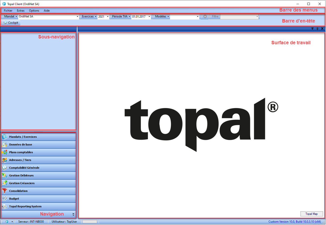Avec Topal Comptabilité Générale, vous avez acquis un logiciel modulaire que vous pouvez adapter et configurer individuellement selon vos besoins. Topal Comptabilité Générale se compose de différents modules. Leur nombre peut varier en fonction de la licence. Les champs de saisie ainsi que les éléments de navigation se présentent dans le style familier de Microsoft Outlook