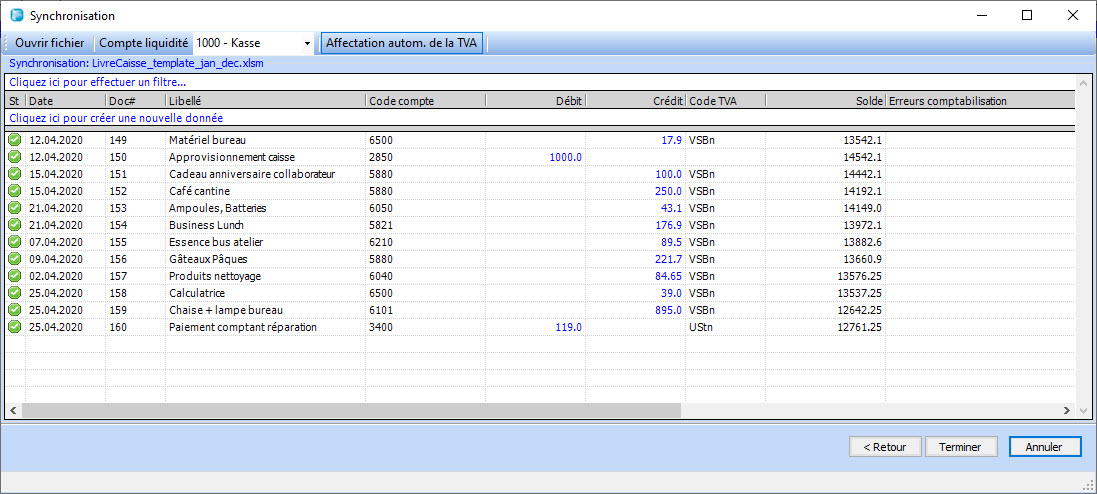 Une spécialité de la fonction de livre de caisse est l'attribution automatique des codes de TVA. Si vous oubliez les codes TVA lors de la création du fichier Excel du livre de caisse,