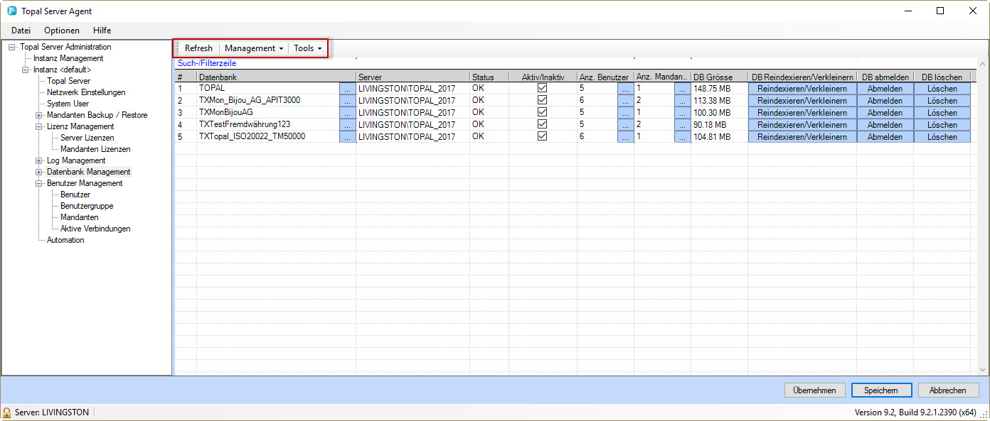 Topal stellt die Möglichkeit bereit, mehrere unabhängige SQL Server anzubinden und zu verwalten. Topal erlaubt Ihnen aber auch pro Mandant eine Datenbank oder eine Partition mit