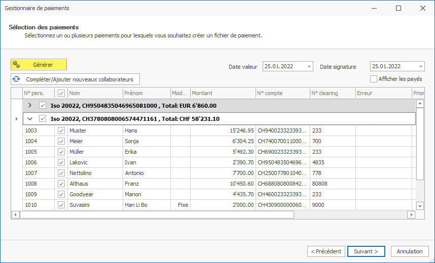 Dans la fenêtre suivante, cliquez sur "Générer". Les paiements de salaire en attente sont affichés par compte de débit. Si vous avez déjà préparé des paiements mais que vous ne les avez pas encore déclenchés et qu'un calcul de salaire doit encore être ajouté, cliquez sur le bouton "Compléter / Ajouter nouveaux collaborateurs". Dès que tous les collaborateurs sont mentionnés, cliquez sur "Suivant".