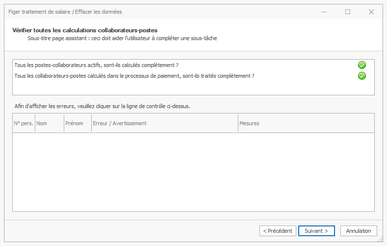 Dans la deuxième étape (illustrée ci-dessus), Topal Payroll vérifie si tous collaborateurs ont été calculés et si les paiements correspondants ont été préparés. Si un point est rouge, vous pouvez sélectionner cette ligne et les personnes correspondantes s'affichent. Vous pouvez ainsi également vérifier si les personnes non calculées ne reçoivent pas de paiement pour cette période. Cliquez ensuite sur "Suivant".