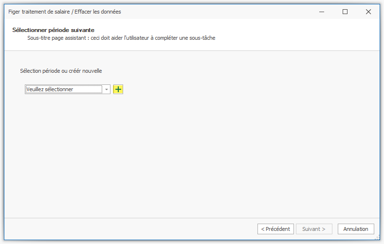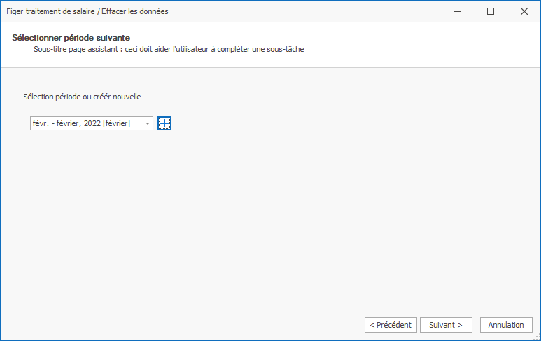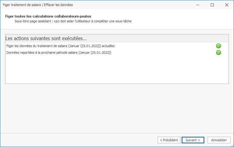 Pour finaliser le traitement des salaires et ouvrir le traitement suivant, cliquez sur le menu "Figer période de salaire". Un assistant s'ouvre alors, qui vous guide pas à pas dans la fixation du traitement des salaires. Cliquez directement sur "Suivant" dans la première fenêtre.