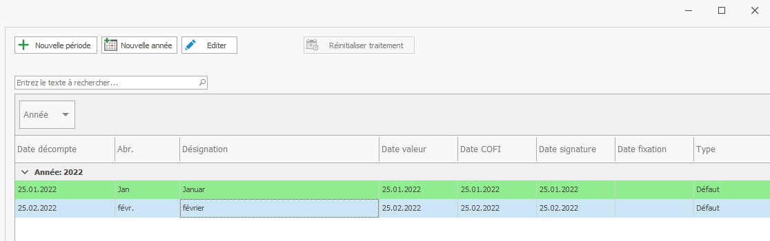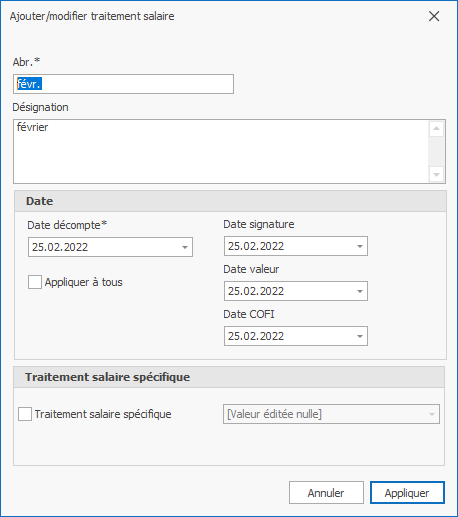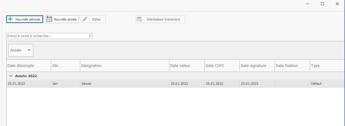Lors du choix de la date, il faut tenir compte du fait qu'une seule date de décompte peut être utilisée par jour civil. Si vous prévoyez traitements de salaire par mois, ceux-ci doivent impérativement avoir des dates de décompte différentes. Les dates de signature, de valeur et de la COFI ne sont pas concernées. Ici, la même date peut être utilisée plusieurs fois.