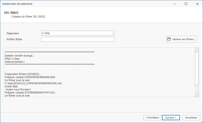 L'étape suivante consiste à générer le fichier de paiement xml. Sous "Répertoire", le chemin spécifié comme standard dans les options apparaît. Ce répertoire peut également être sélectionné manuellement via les 3 points.