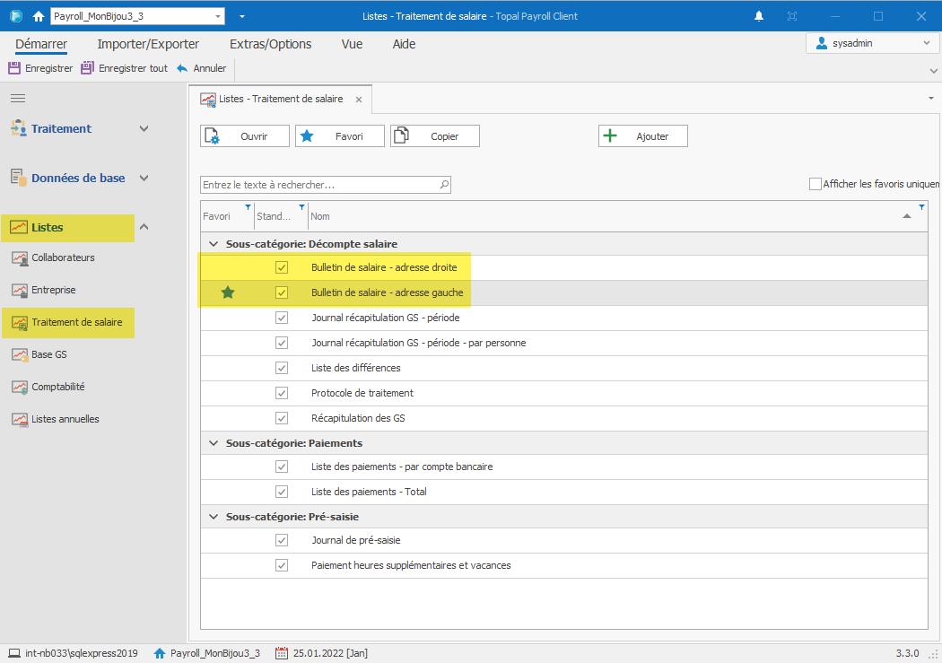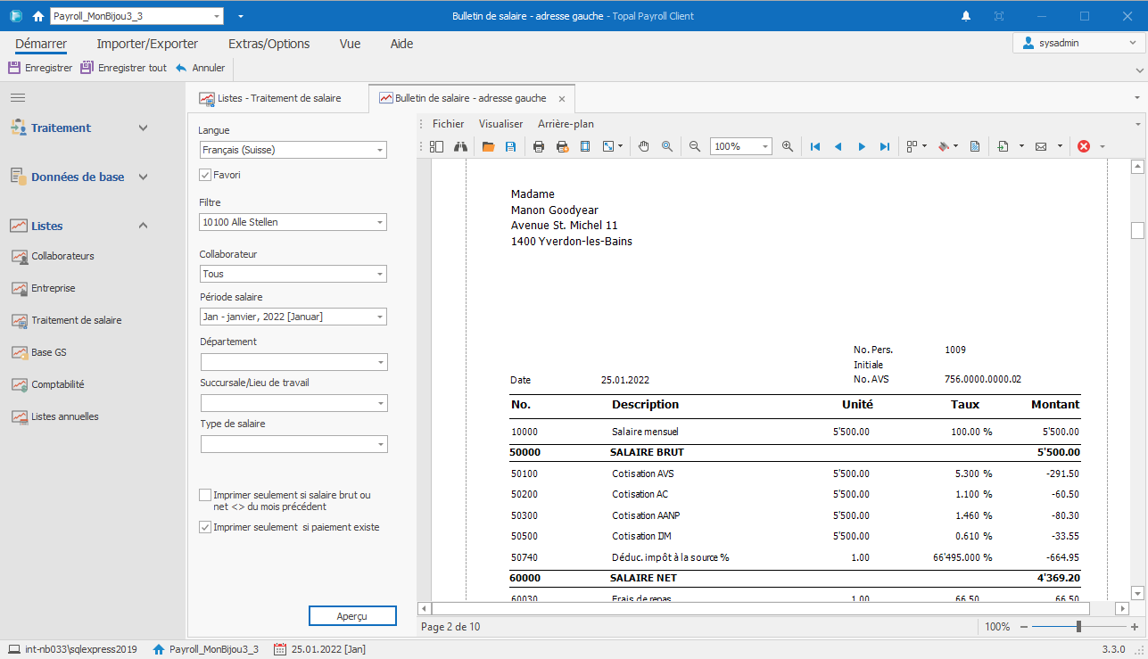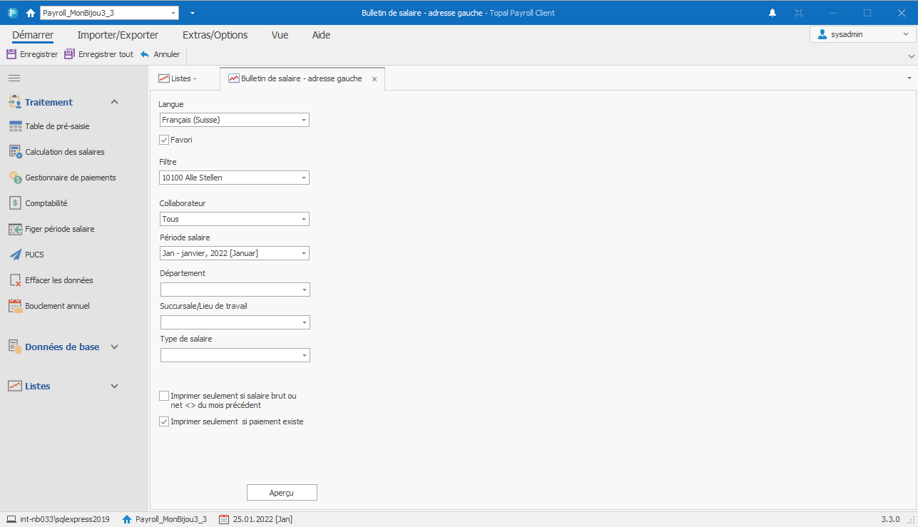 Les bulletins de salaire peuvent déjà être consultés après le calcul des salaires depuis le menu Listes, mais elles ne contiennent pas encore les numéros de compte des collaborateurs.