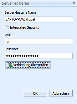 Öffnet ein Fenster, um die Instanz anzugeben. Für die Verbindung muss ein Login angegeben werden, welches über die Berechtigung verfügt, neue Datenbanken anzulegen und zu verwalten (sa-Login oder gleichwertig).