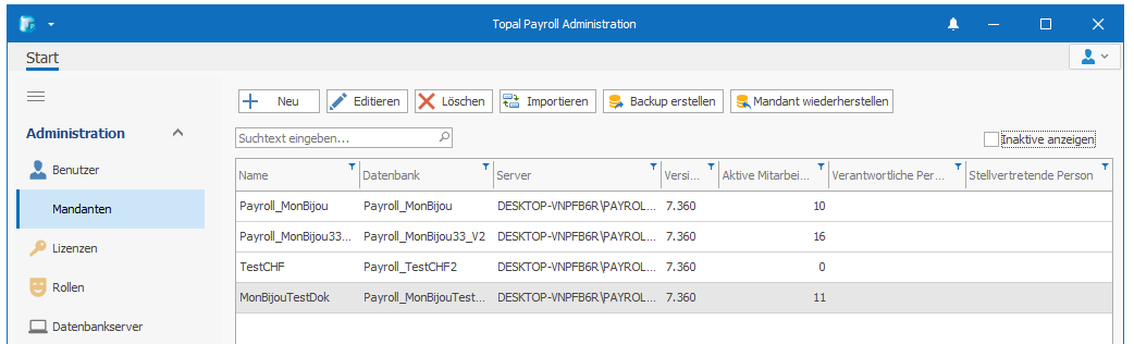 Unter dem Menü "Mandanten" werden die jeweiligen Topal Payroll Datenbanken erstellt, verwaltet, gesichert und gelöscht.