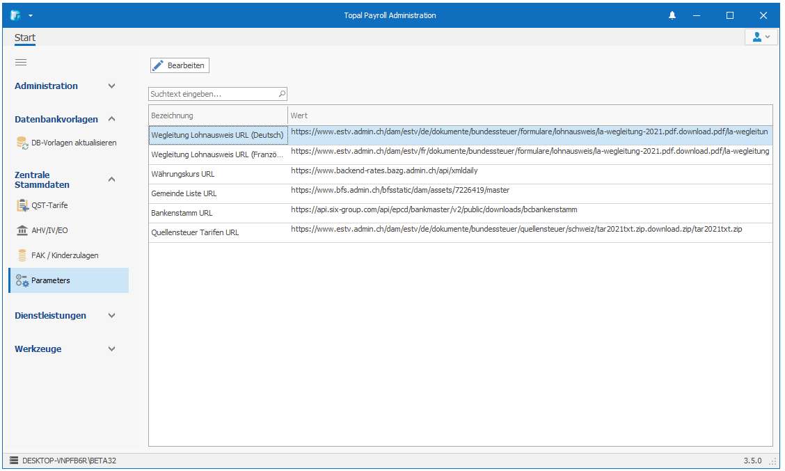 Unter den "Parameters" sind sämtliche URL-Pfade hinterlegt, auf welche Topal Payroll zugreifen kann.