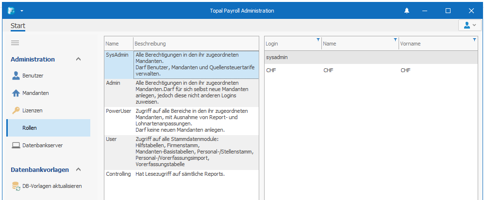 Unter den Rollen versteht Topal Payroll die verschiedenen Benutzerrechte bzw. Benutzerprofile.