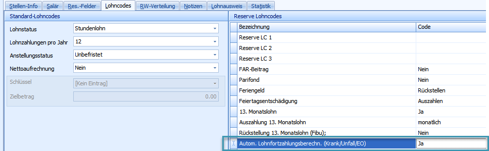 Soll die Funktionalität von automatischer Lohnreduktion und reduzierter Lohnfortzahlung im Absenzfall genutzt werden, muss der entsprechende Lohncode im Stellstamm gesetzt werden: