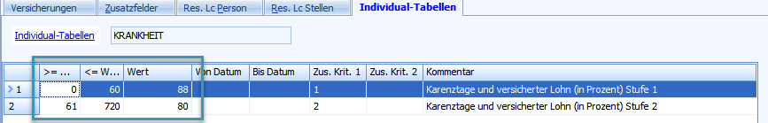 Konfigurieren Sie hier die Anzahl Tage und Prozentsatz der Lohnfortzahlung. Es sind zwei Abstufungen möglich. Die Werte in der Spalte Zus. Krit. 1 müssen stehen gelassen werden.
