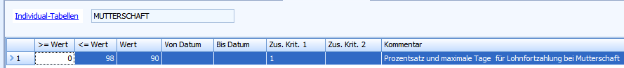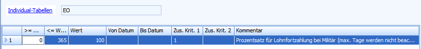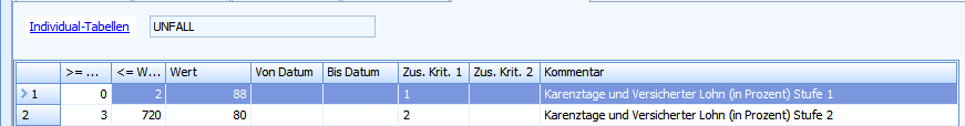 Konfigurieren Sie hier die Anzahl Tage und Prozentsatz der Lohnfortzahlung. Es ist nur eine Stufe möglich. Der Wert in der Spalte Zus. Krit. 1 muss stehen gelassen werden.