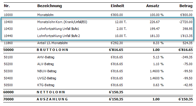 Topal Payroll reduziert danach automatisch den Lohn für die Anzahl Tage mit dem 100%-Ansatz und zahlt die Lohnfortzahlung entsprechend den Angaben in den Stammdaten aus: