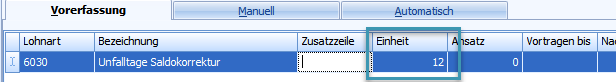 Beim Hinzufügen der Lohnart wird standardmässig der aktuelle Saldo als Einheit vorgeschlagen. Soll dieser nicht auf 0 gesetzt werden, kann dies manuell übersteuert werden: