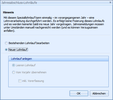 Im ersten Dialog wird gewählt, ob ein neuer Lohnlauf erstellt, oder ein bestehender bearbeitet werden soll. Existiert im vergangenen Jahr bereits ein solcher Lohnlauf, können die Daten (plus 1 Jahr) und die Vorerfassung übernommen werden.