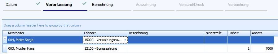 Hier werden den Personen die Lohnarten und Beträge zugewiesen. Es stehen nur Lohnarten zur Auswahl, welche im Lohnartenstamm entsprechend definiert wurden.