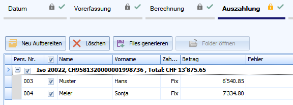 Beim Wechsel in diesen Schritt werden die Auszahlungsdateien automatisch aufbereitet. Die Angaben können im unteren Bereich kontrolliert und anschliessend die Auszahlungsdateien generiert werden. Ein Klick auf den Button Folder öffnen öffnet den Ordner mit den Auszahlungsdateien im Datei-Explorer.